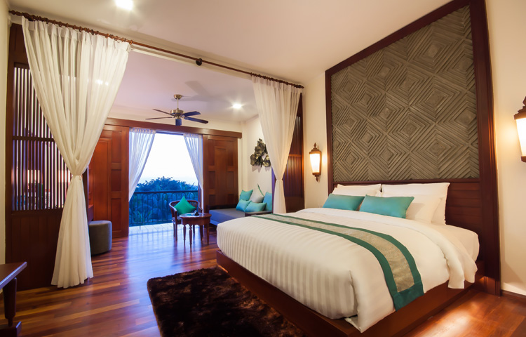 Our leading category of Deluxe room has a rich décor that blends well with our peaceful and tranquil surroundings. Each Deluxe room is furnished with traditional Khmer furniture made of teak with silk accessories.